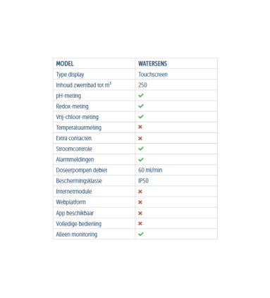 Met Watersens geniet je zorgeloos van schoon, helder en comfortabel zwembadwater. Dit slimme doseersysteem controleert automatisch de pH-waarde en het chloorgehalte van uw zwembad en stuurt deze bij wanneer dat nodig is. Zo blijft het water continu in balans, zonder dat je zelf steeds handmatig hoeft te meten en doseren.